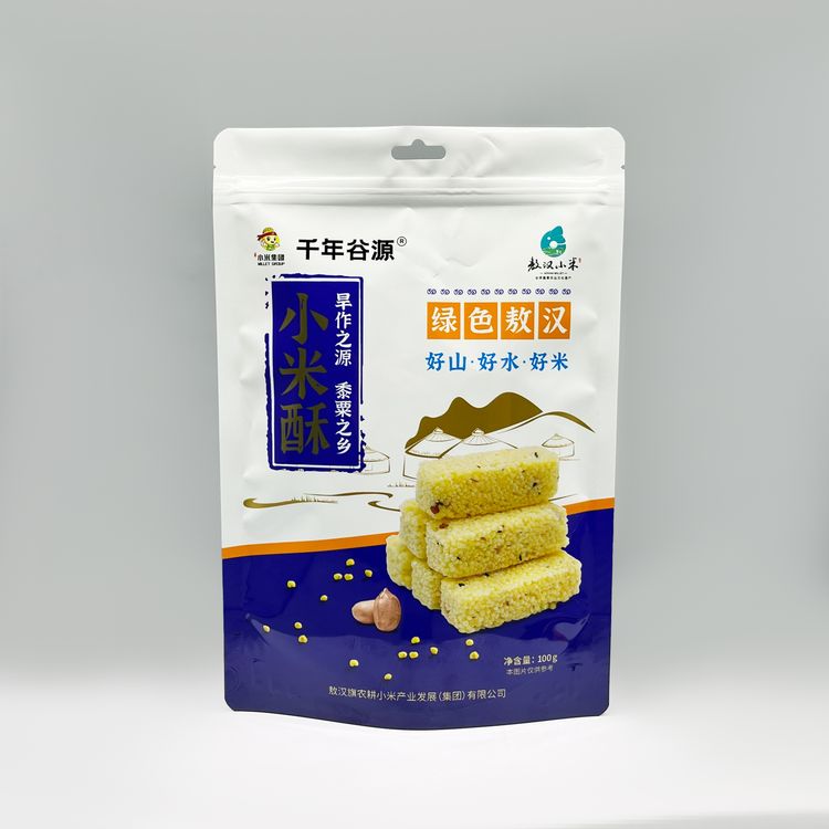 这款小米酥的包装由巨人纸塑包装生产,选用纯铝箔材质,袋型为自立带拉链袋。